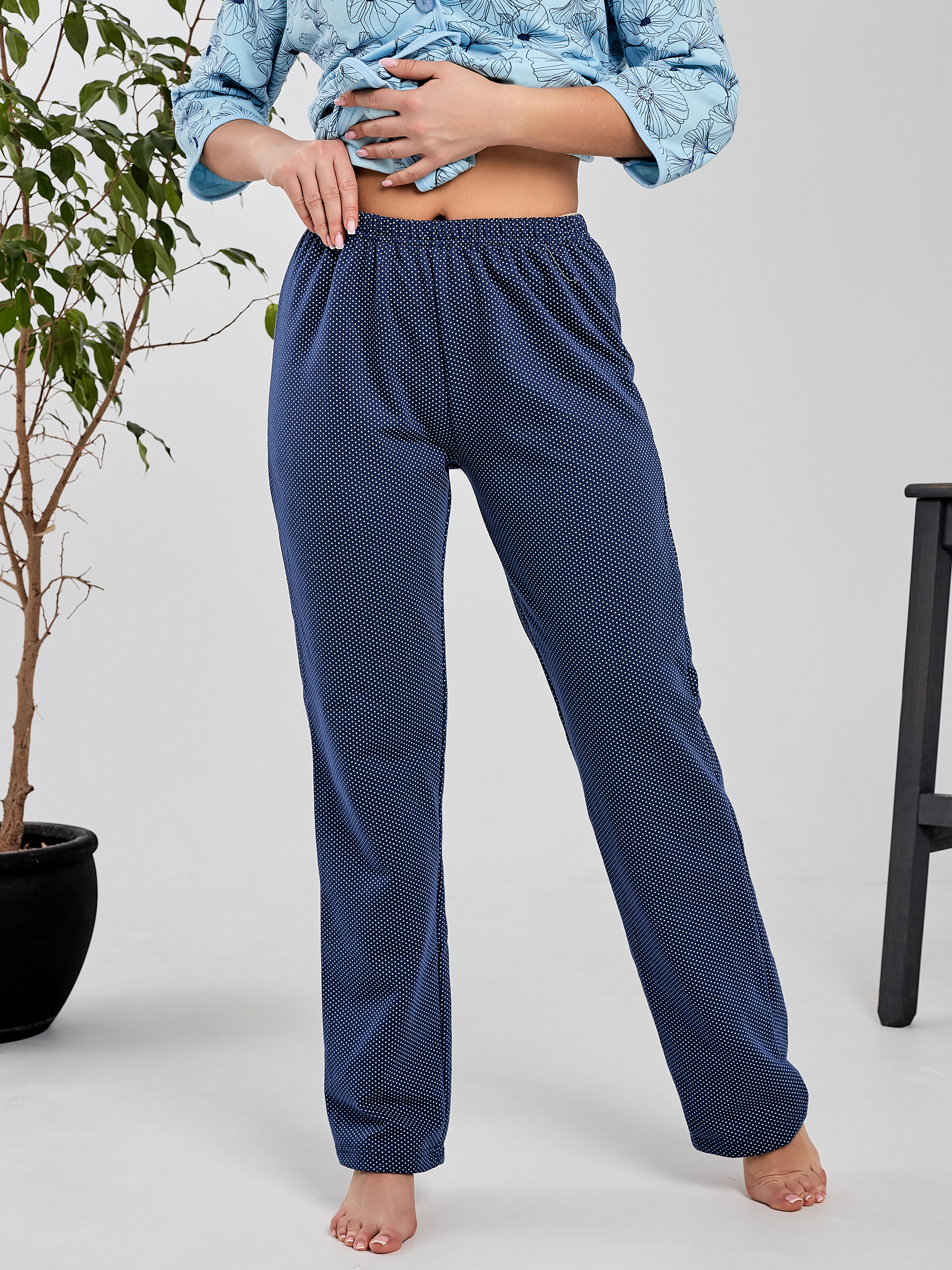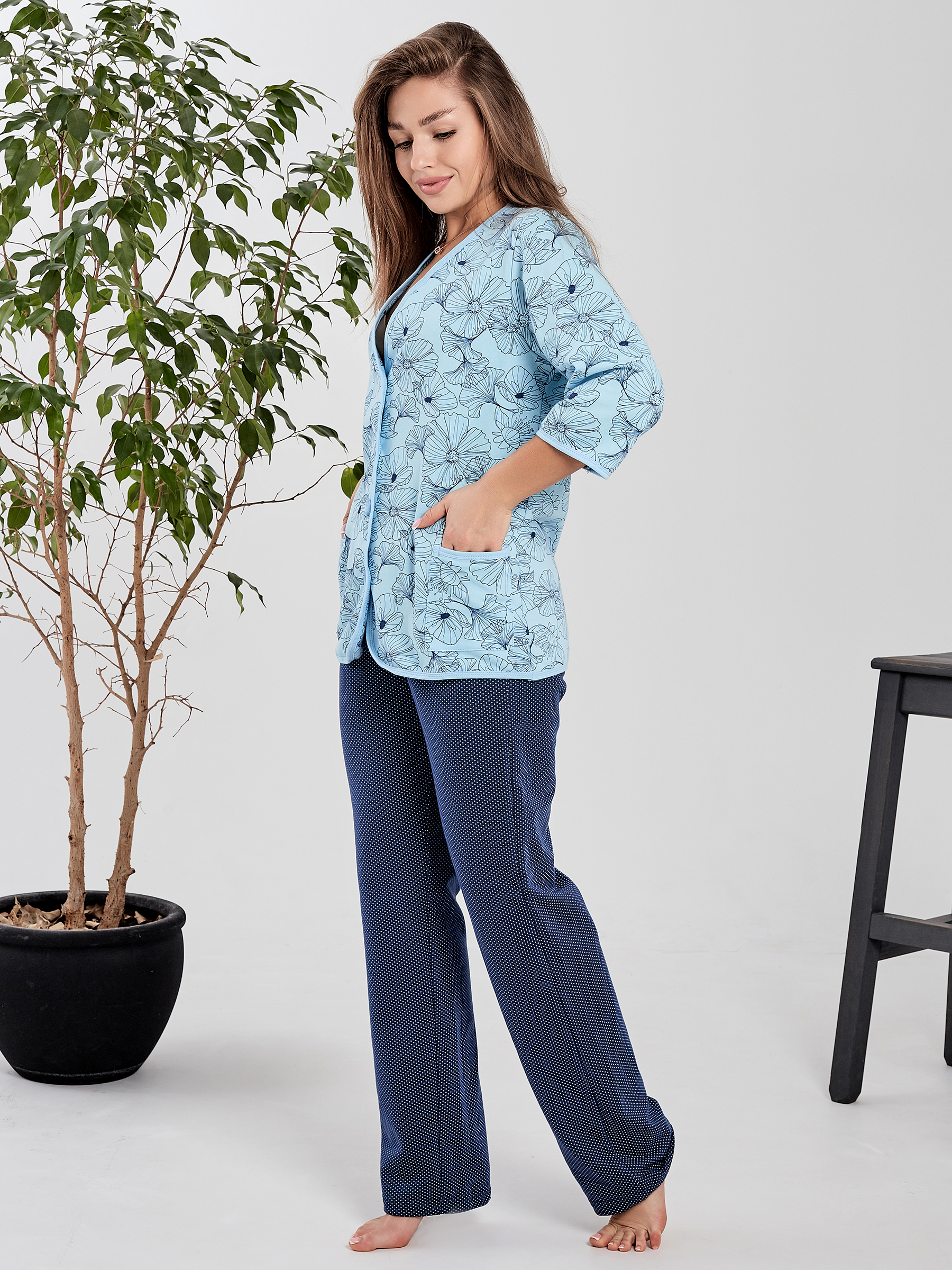 Пижама домашняя на пуговицах зимняя с брюками трикотажная удачного фасона для любых типов фигур.