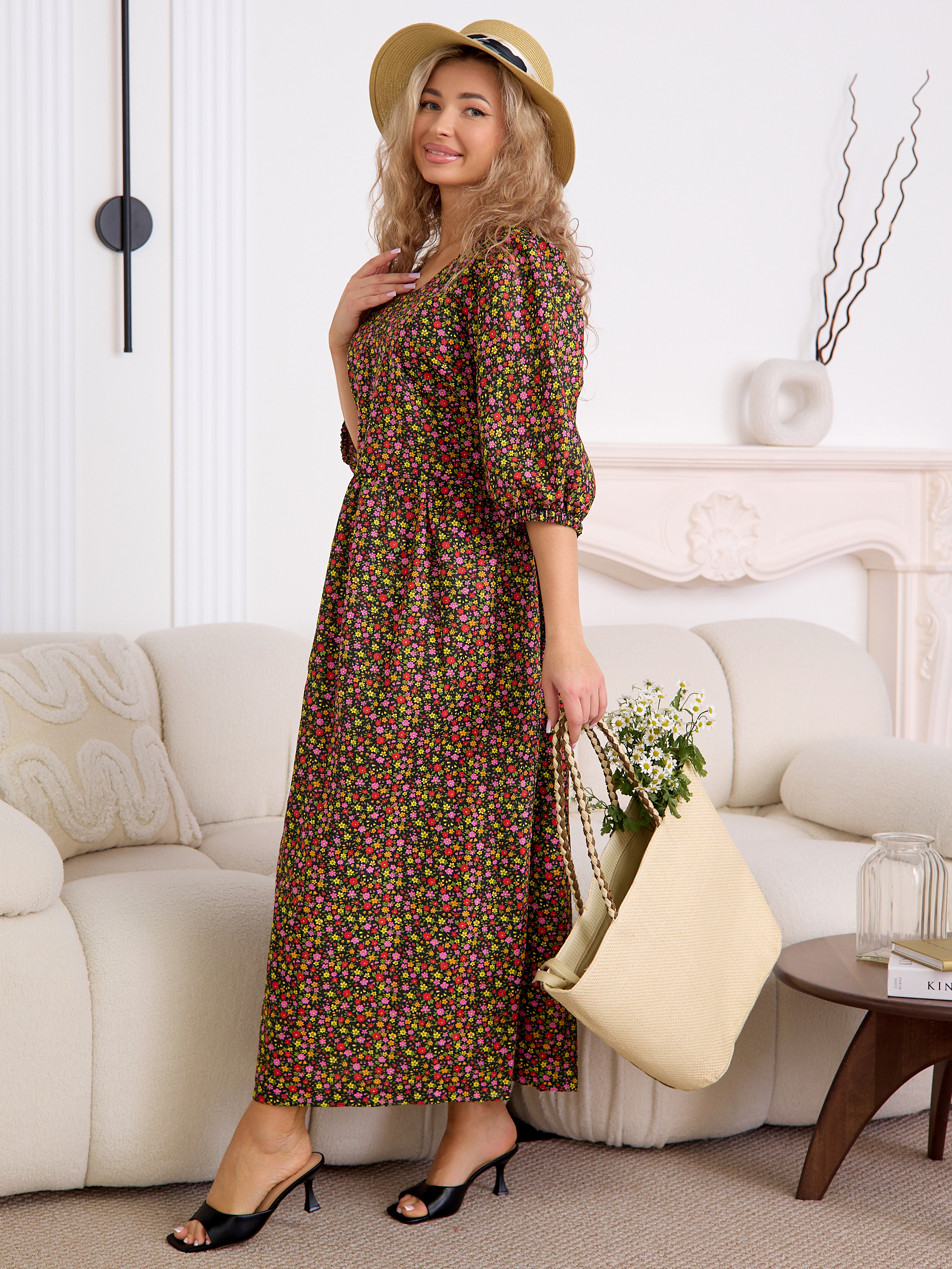 Рукав 3/4 с резинкой внизу — практичная и стильная деталь, которая завершает образ в духе «платья-крестьянки».